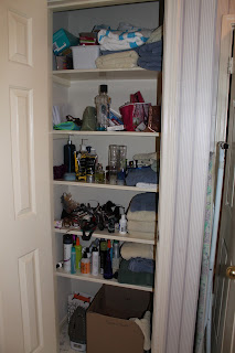 So with spring comes spring cleaning!!! and I have the spring cleaning fever REALLY bad this week. I reorganized and cleaned out the kitchen, the playroom, my closet, and our bathroom closet. Since the bathroom is still the only place in the house that has not been worked on or finished the closet just kind of got thrown together and it drives me CRAZY!! I eventually want to paint the shelves dark and take off the door because we have too many doors in that bathroom. But, in order to do that it would need to be presentable and organized! So as embarrassing as it may be...here is my before closet....